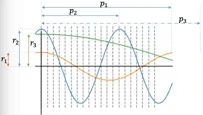 在图15中,每个维度都表示为一个波,该波由振幅,周期/频率和初始相位参数化。嵌入的可训练参数是振幅向量,周期或频率相关的权重
