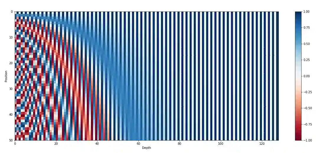 ,纵坐标为位置 pos 。不难发现,当维数逐渐从 0 变为 127,周期相应的从 2π 变为 2π*10000,不同位置之间的差异性变得越来越模糊。