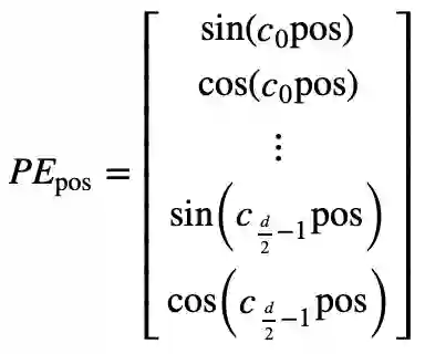 在等式 (5) 里的通用定义中,每个维度的位置嵌入是基于离散位置索引 {0, 1, 2, …, pos, …} 获得的。这使得很难建模位置之间的有序关系。该问题的一种解决方案是在位置索引上构建连续函数,以表示特定单词的单个维度。形式上,我们将通用嵌入定义为: