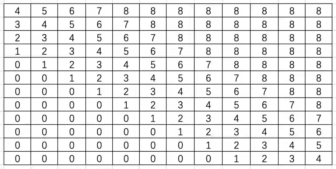 这里试举一例帮助理解。当输入句子长度为 12 且 k = 4 时, RPR 的嵌入矩阵如图8所示: