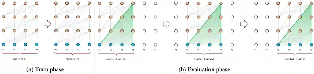 尽管 Al-Rfou et al. (2018)[8] 成功地在字符级语言建模中训练了深度(64 层) Transformer 网络,效果超越了 LSTM,但是其输入为分离的、固定长度(几百个字符)的片段,并且没有跨片段的信息传递。由于固定的上下文长度,模型无法捕获超出预定义的上下文长度的任何长期依赖。另外,固定长度的片段是通过选择连续的字符块而创建的,并未考虑句子边界或任何其他语义边界。因此,该模型缺乏必要的上下文信息来较好地预测最初的几个字符,这会导致无效的优化和较差的性能。
