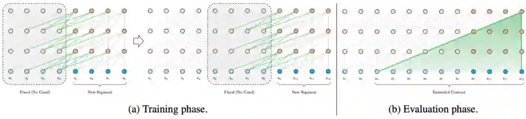 这里我们先来看 Transformer-XL 中的片段循环机制。引入循环机制,在训练过程中,前一片段中的隐藏状态序列(每一层都)会被固定并缓存,以便在处理下一片段时使用其作为「扩展上下文」。如图 12.a 所示,绿色部分表示当前片段使用的扩展上下文。对于每一层而言,输入为前一片段以及当前片段的前一层的输出,从而可以保证对长期依赖的建模能力并避免了上下文碎片问题(图 13)。