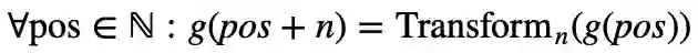 。也就是说同一单词在不同位置的表示,可以通过一个只和相对距离 n 有关的变换函数进行转换。