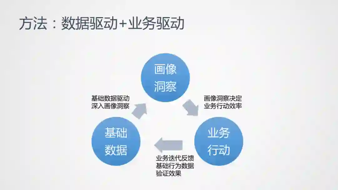 基础数据驱动的用户画像洞察,当提炼出一些标签以后,会决定业务行动的效率。比如对流失了3天的用户,要做一些促活的活动,先会通过数据提炼出流失3天的一些用户,去做用户激活,比如push ( 消息推送 ),进行push之后可以拿到基础数据反馈的结果,从而更好的驱动用户画像标签的优化。