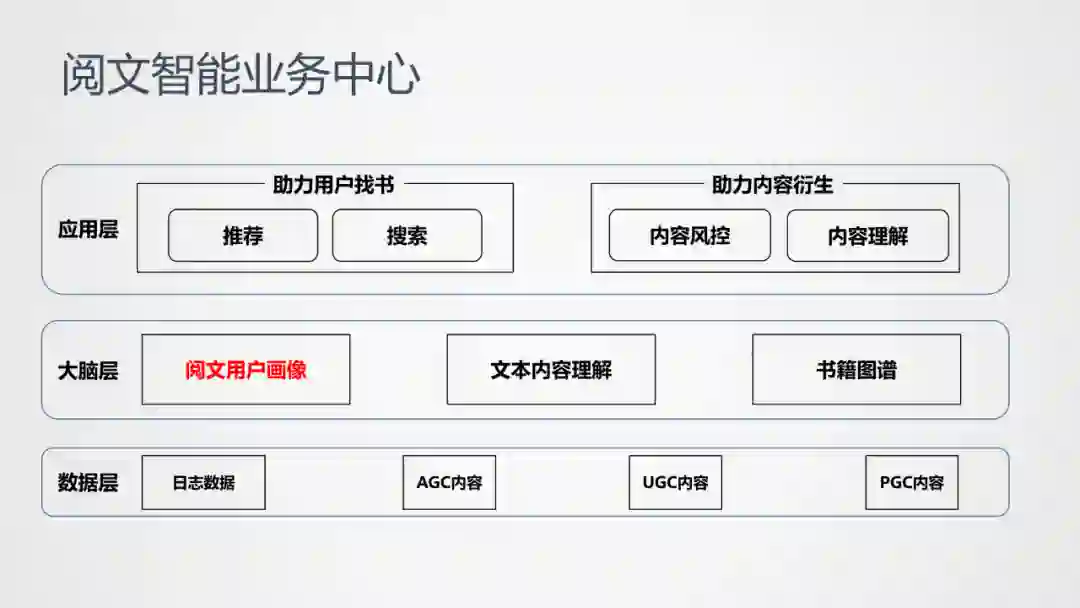 阅文智能业务中心的整体架构主要分为:数据层、大脑层和应用层。