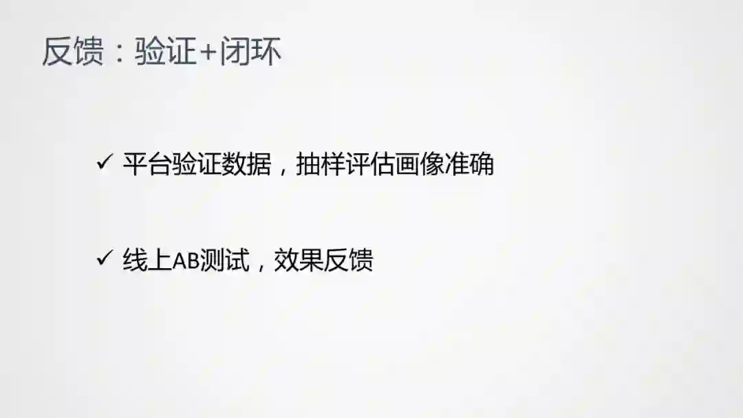 对于建设整体的标签体系,反馈是非常重要的一环,用来保证用户画像的准度。主要方法有: