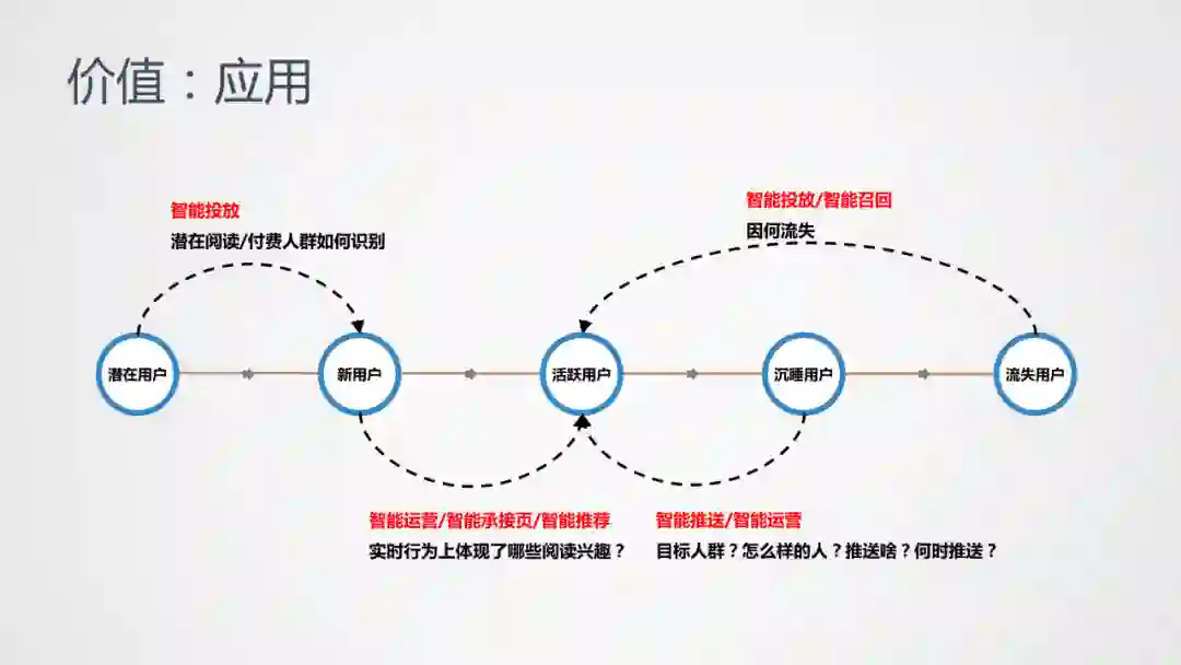 用户画像的应用价值在哪里?我们通过整体的用户生命周期就可以很容易看出用户画像的价值。从潜在用户到新用户,可以识别潜在阅读/付费人群,来进行智能投放;从新用户到活跃用户,可以通过实时行为看出用户的阅读兴趣,来进行智能运营、智能承接页、智能推荐等;还包括未来的流失召回,以及自己用户的激活都跟用户画像息息相关。