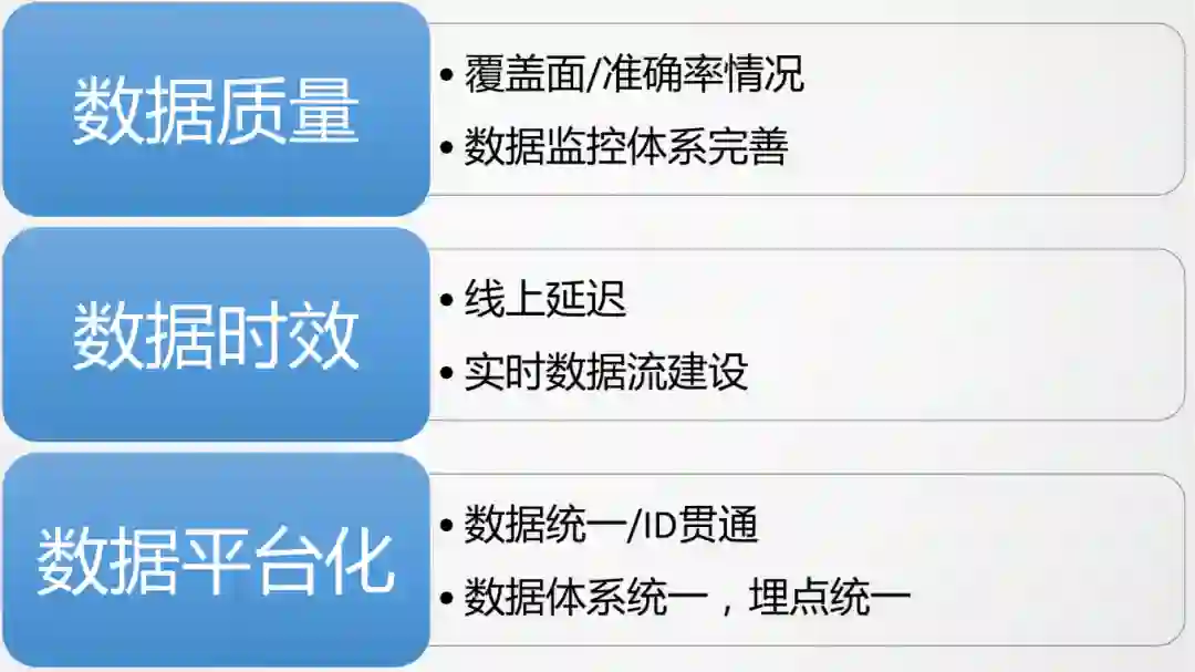 数据质量:如何保证数据的覆盖面和准确率?这需要一套完整的数据监控体系,通过数据监控体系完善数据的覆盖面和准确率。比如能够通过数据监控体系看到每次发版灰度流量时,数据有没有变少,覆盖面有没有降低,准确率有没有降低等。