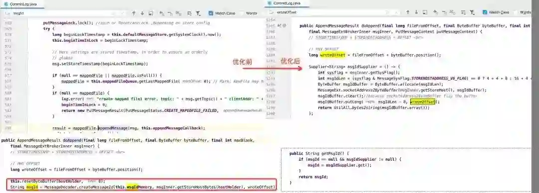 新版本采用函数式编程的思路,只是定义来获取msgId的方法,在进行消息写入时并不会执行,降低锁的粒度,使得offsetMsgId的生成并行化,其编程手段之巧妙,值得我们学习。