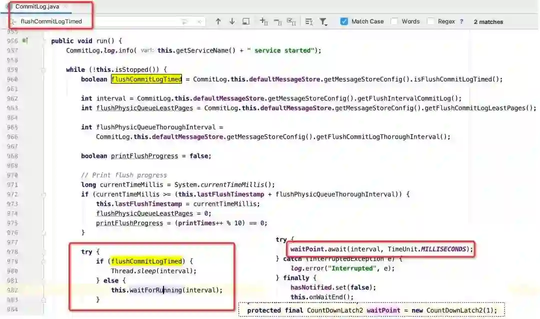 其主要作用是控制刷盘线程阻塞等待的方式,低版本flushCommitLogTimed为false,默认使用CountDownLatch,而高版本则直接使用Thread.sleep。猜想的原因是刷盘线程比较独立,无需与其他线程进行直接的交互协作,故无需使用CountDownLatch这种专门用来线程协作的“外来和尚”。
