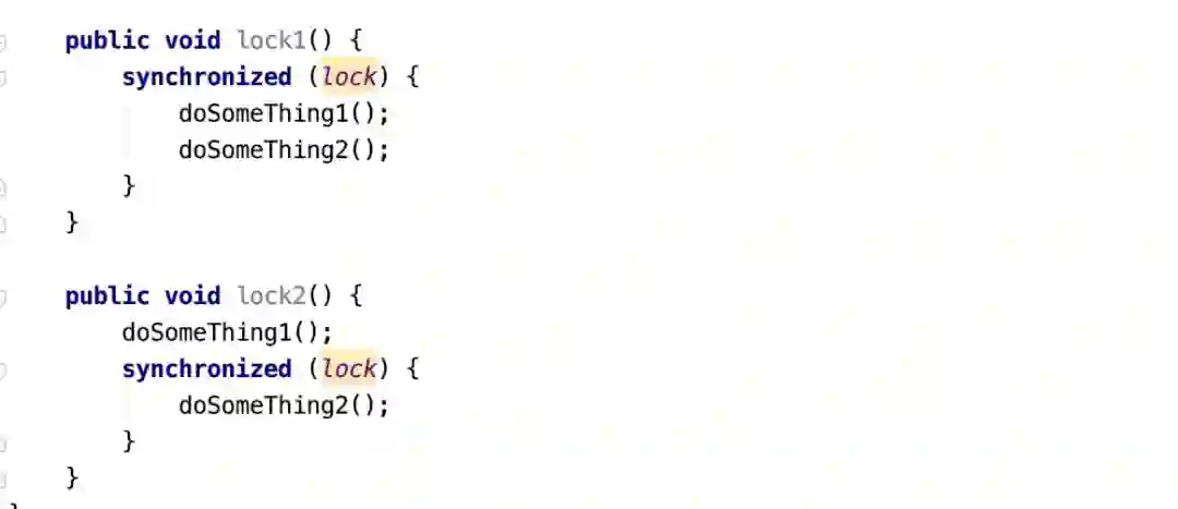 如果多个线程区访问lock1,lock2,在lock1中domSomeThing1、domSomeThing2这两个方法都必须串行执行,而多个线程同时访问lock2方法,doSomeThing1能被多个线程同时执行,只有doSomething2时才需要串行执行,其整体并发效果肯定是lock2,基于这样理论:得出一个锁使用的最佳实践:被锁包裹的代码块越少越好。