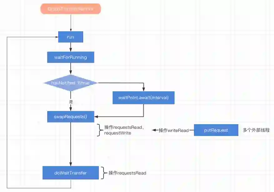 整个GroupTransferService中在多线程环境中运行需要被保护的主要是requestRead与requestWrite集合,引入的锁的目的也是确保这两个集合在多线程环境下安全访问,故我们首先应该梳理一下GroupTransferService的核心方法的运作流程: