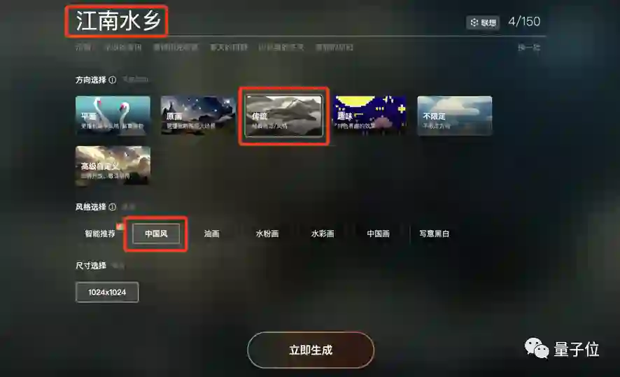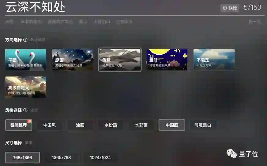 例如输进去极具古典韵味的“江南水乡”,然后在方向和风格上选择“传统”、“中国风”。
