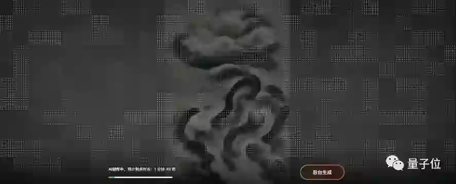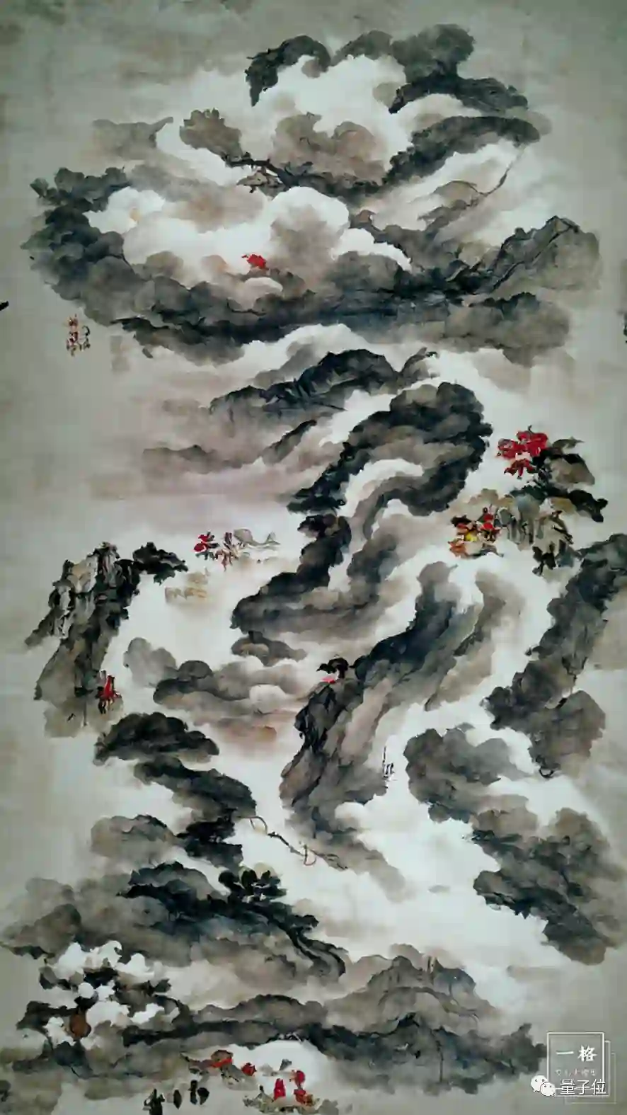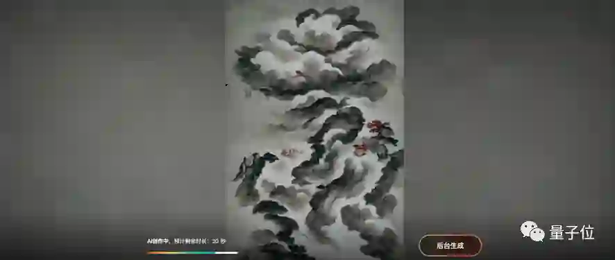 很快,AI“拆解”文本后,理解要怎么画这幅画了,于是在特定尺寸(用户可选)的画纸上,构思出整体的轮廓,兼具云的元素和中国画的风格: