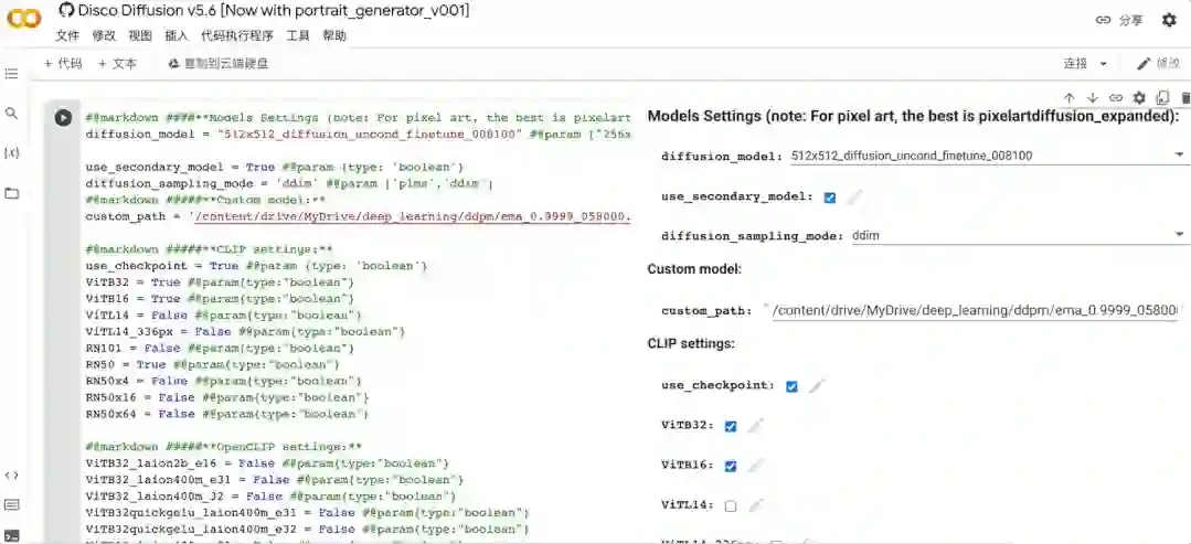 它直接在谷歌Colab上运行,需要申请账号后使用(图片生成后保存在云盘),图像分辨率、尺寸需要手动输入,此外还有一些模型上的设置。