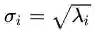 通过上面*式的证明,我们还可以看出,特征值矩阵等于奇异值矩阵的平方,也就是说特征值和奇异值满足如下关系: