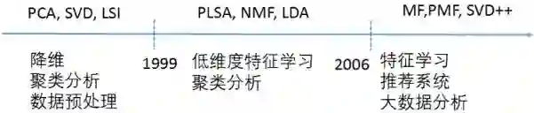 关于矩阵分解的方法大概就是上面这些。矩阵分解的主要应用是:降维、聚类分析、数据预处理、低维度特征学习、特征学习、推荐系统、大数据分析等。上面把主要的矩阵分解方法给列出来了,比较混乱,再给大家摆上一张矩阵分解发展的历史: