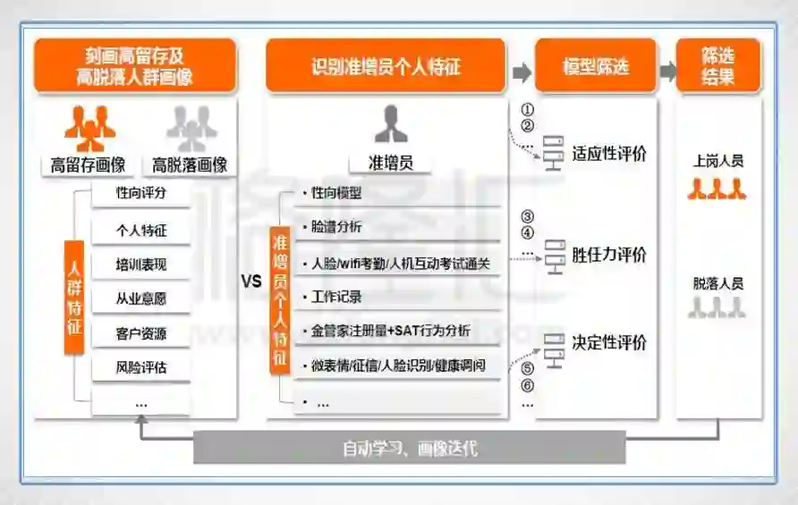 比如,运用大数据生成客户画像,实现差异化客户经营,精准投放产品。再比如将智能科技运用到寿险业务员的招募,可以做到精准和高效,提高留存率。在招募环节,对每个面试者的言行进行记录,得到一系列标签,存入面试者画像库;而在试用或入职后,对其销售行为模式进行记录分析,可以得到具有高销售业绩的从业员具有的特征,将高留存画像匹配到面试者画像库中,便可以得到潜在高留存者的面试表现特征。