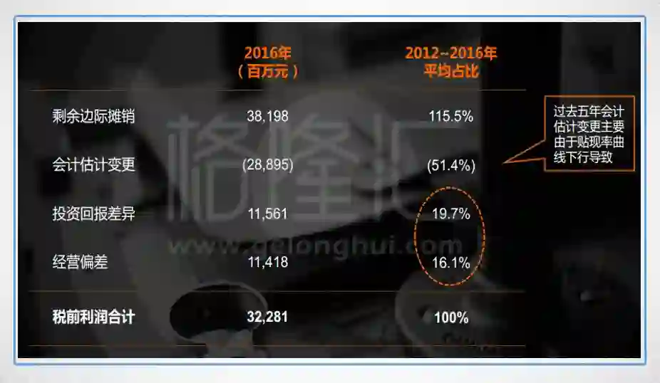 过去五年剩余边际是正的,投资回报和经营偏差也是正的,主要是会计估计变更由于利率下行拖累利润释放,但是今年以来十年期国债利率曲线开始重回3.5%,在2018年会计估计变更的负面影响将会大幅减小。以剩余边际每年35%以上的释放增速,寿险业务增速37.7%确实是个小目标。