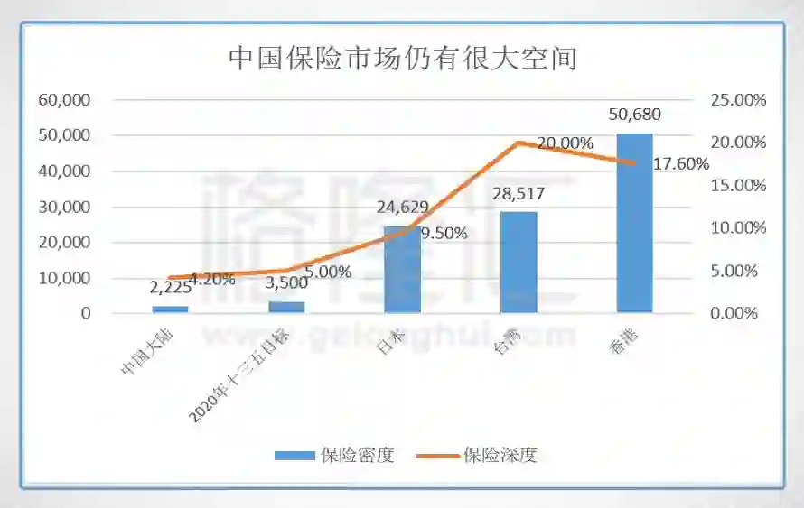 国内保险市场实在肥美,未来空间十分广阔。无论是保险深度(保费收入/GDP)和保险密度(人均保费收入)都远低于国际平均水平,与国外发达国家的差距更大,差距就是成长空间。
