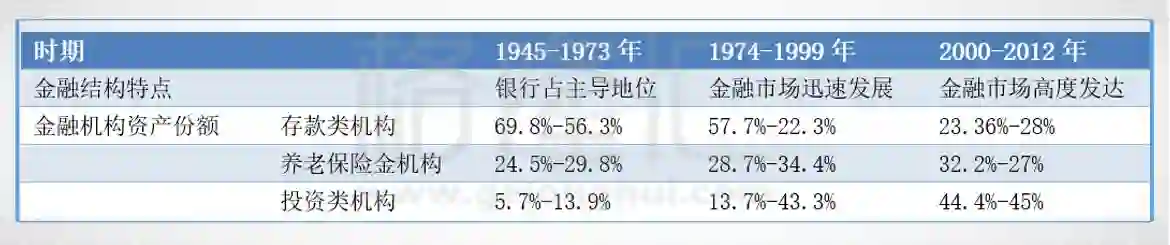 在评选四大条件中,宇宙行凭借中国绝对的头部资产就能拿到入场券了。但是,以美国的金融市场发展经验看,经过以银行业为主导地位阶段后,金融市场进入快速发展阶段,间接融资的银行等存款类机构的占比不断下降,而保险、证券等则是顺势崛起。资料来源:张立强,《转型时期我国金融结构研究》,2013-5