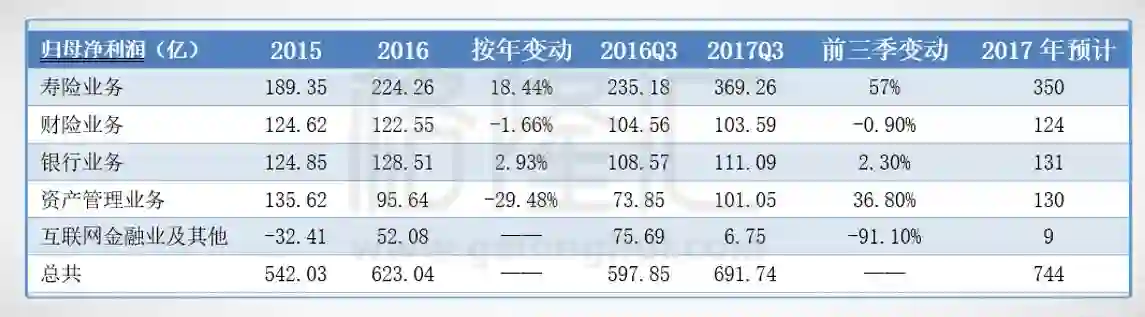 2017年Q3平安的归母净利润是663亿,其中超过一半是寿险净利润,从近两年的净利润结构看,寿险的净利润比重逐渐提升。由于2017年还未有年报,基于2016年年报和前三季度的数据,预计2017年平安的净利润在744亿左右。(注:互联网金融业波动比较大,主要是司2016年上半年有一笔普惠金融重组94.97亿元的交易)