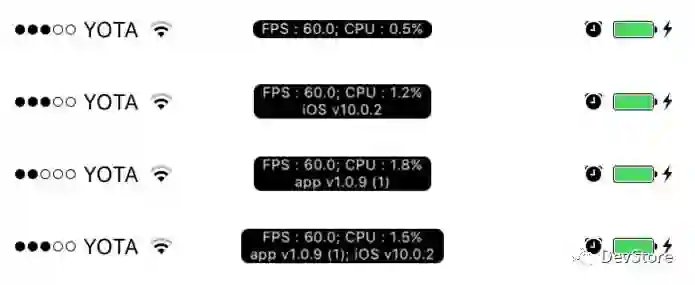 GDPerformanceView 可以在状态栏上方显示 FPS、CPU 使用情况以及应用版本和 iOS 版本,并通过 delegate 报告 FPS 和 CPU 使用情况。
