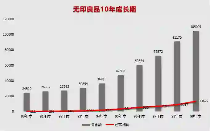 但无印良品90年销售额只有245亿日元,经常利益(経常利益=営业利益+営业外収益-営业外费用)只有1亿日元,然而到99年时,经常利益已经达到136亿日元。