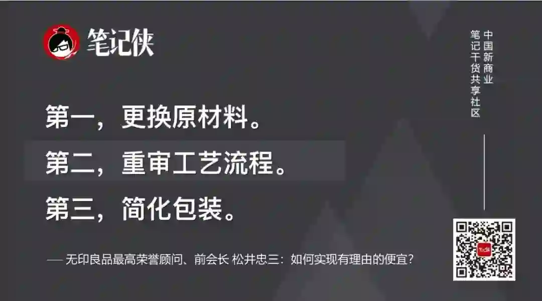 就这样,通过严选材料到简化工序,再到简化包装,运用这三样动作就能够用更加优惠的价格把高品质的商品提供给顾客。