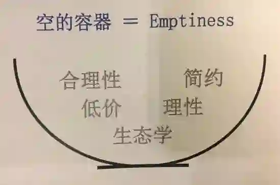这张图片非常形象化地体现了“空的容器”这样的概念,无印良品开发出来的商品都是相当于一个空的容器,里面可以容纳所有的价值观,比如说合理性、简约、低价、生态学、理性这样的价值观: