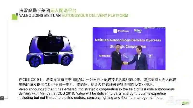 除了要在限定时间、限定区域内行驶,无人驾驶出租车是最接近自动驾驶全面商业性落地的一步,但也正因如此,能在这一领域做好的企业也少之又少。当然,在以上特定应用场景以外,还有其他一些细分无人车市场,例如外卖送餐,法雷奥在今年1月就与美团达成了合作,共同开发物流车与无人送餐车。