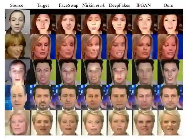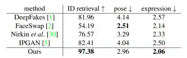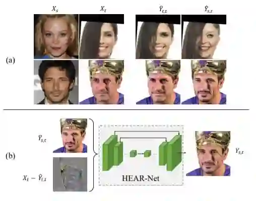架构的第二部分主要解决面部遮挡问题,这部分包括一个新的启发式错误确认细化网络(HEAR-Net)。训练后,可以以自监督的方式恢复图像的异常区域,无需任何手动注释。在新面部图像上进行的大量实验表明,与其他方法相比,本文模型生成的换脸图片结果不仅在感观上更真实、更具吸引力,而且还保留了原图像更多的特征。