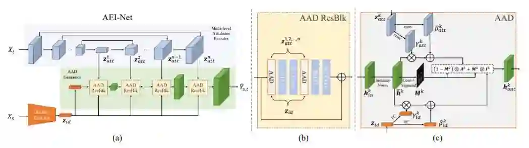 第一阶段的AEI-Net结构。AEI-Net由身份编码器,多级属性编码器和AAD生成器组成。AAD生成器使用在AAD层上构建的级联AAD ResBlk,可在多个功能级别中集成图像特征和属性的信息