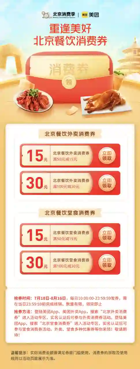 从7月18日到8月16日,每天上午10点,北京市消费者可登陆美团、美团外卖App抢券,抢券成功后,可在消费者所在的各区域对应的线下商户及美团平台消费使用,市民可在活动页面内查看具体商户名单。