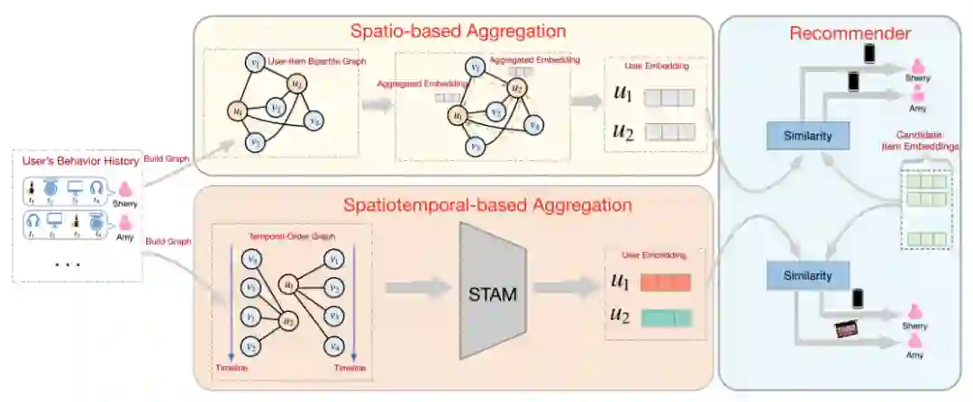 在之前的基于 GNN 的推荐中,邻居聚合方法仅涉及空间结构信息,而忽略了邻居的时间信息,无法捕获用户的动态兴趣。电子商务平台的基本功能是收集丰富的用户行为历史以及时间信息。然而,之前基于 GNN 的推荐中的聚合方法尚未充分利用这些时间信息来学习高质量的嵌入表示,并且只能展示用户的内在兴趣。为了充分理解这项工作的动机,我们给出了一个 STAM 示例来展示时间信息在基于 GNN 的推荐中的重要性。如下图所示,推荐系统在基于空间聚合中为Amy 和 Sherry 推荐相同的商品,而在基于时空的聚合中推荐不同的商品。在基于时空的聚合方法中,将时间信息整合到邻居嵌入学习中,其中时间顺序在捕获用户的动态兴趣和用户集群随时间的变化方面起着至关重要的作用。