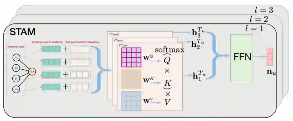 为了将时间信息整合到邻居嵌入学习中,STAM 利用 Scaled Dot-Product Attention 来捕获一阶邻居的时间顺序,并利用多头注意力机制在不同的潜在子空间上执行联合注意力。STAM 的整体架构如下图所示,它以时间序列 Tu 和 Tv 作为输入,输出一阶邻居的时空邻居嵌入表示。STAM 是一种时空聚合方法,从空间结构和时间顺序两个角度同时学习邻居的嵌入表示。我们将 STAM 应用到基于 GNN 的推荐中来学习用户和商品的嵌入表示。与基于 GNN 的推荐类似,我们堆叠多个 STAM 以捕获用户-商品二部图中的高阶交互信息。然而,当从一阶邻居逐层传播时空邻居嵌入表示时,STAM 将遭受成倍增加的内存消耗。为此,我们从时空邻居嵌入表示中学习一个时空注意力权重矩阵,并将其整合到邻接矩阵中进行用户/商品的嵌入表示学习。