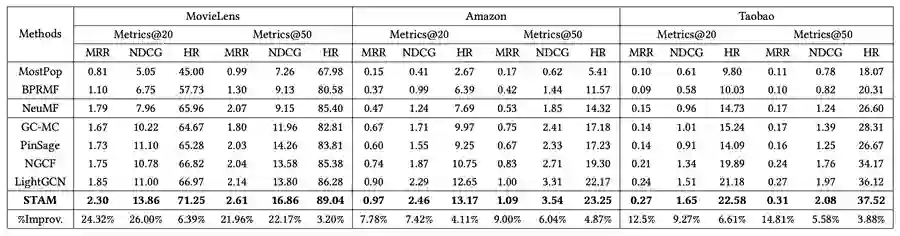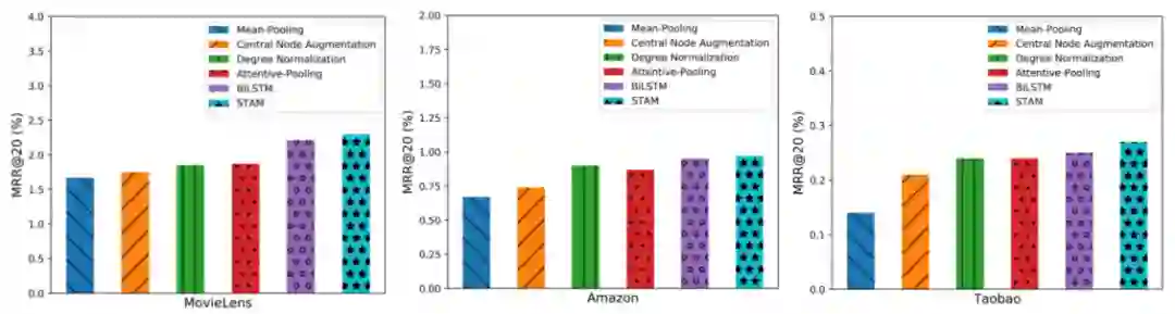 STAM 不改变基于 GNN 推荐的框架,可以很自然地插入到现有的基于 GNN 的推荐模型中。我们将 STAM 应用于基于 GNN 的推荐,并将其推荐性能与具有代表性的基于 GNN 的模型进行比较。实验结果表明,STAM 在 MRR@20 上的平均相对增长超过了目前最佳基线,例如在 MovieLens 带来了 24% 的性能提升,在 Amazon 上实现了 8% 的性能增长,在 Taobao 上优于最佳基线 13%。性能提升的原因来自于在邻居聚合中考虑了时间信息的影响,验证了时间信息对于邻居聚合方法的重要性。