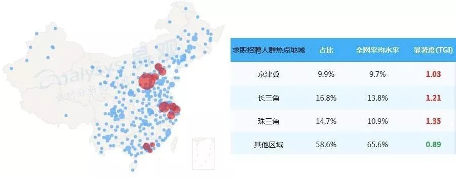 易观万像显示,一线城市及其周边区域是求职招聘的需求集中地区,其中京津冀、长三角、珠三角为热点区域,其显著度(TGI)高于全网平均水平;求职招聘人群在这三个热点区域的占比超40%。