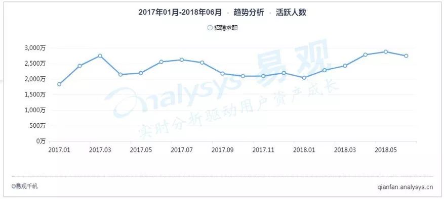 招聘行业一直流传着“金三银四”的说法,从每年2月开始,求职招聘行业都将迎来其旺季。易观千帆数据显示,2017年2月和2018年2月,求职招聘行业月活人数,都有较为明显的增长,随即在5月恢复平稳状态。