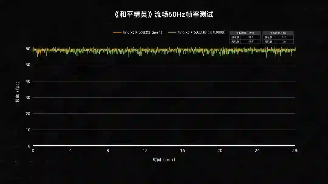 接下来是《和平精英》流畅 60 帧,选这个设置的原因是 Find X5 Pro 天玑版目前还没有适配 90Hz 模式,而且极限帧率只能是在流畅画质下运行。这一环天玑版的帧率表现并不占优,平均 58.9 帧,骁龙版 59.8 帧几乎跑满,不过同样的天玑版的功耗要略低于骁龙版。