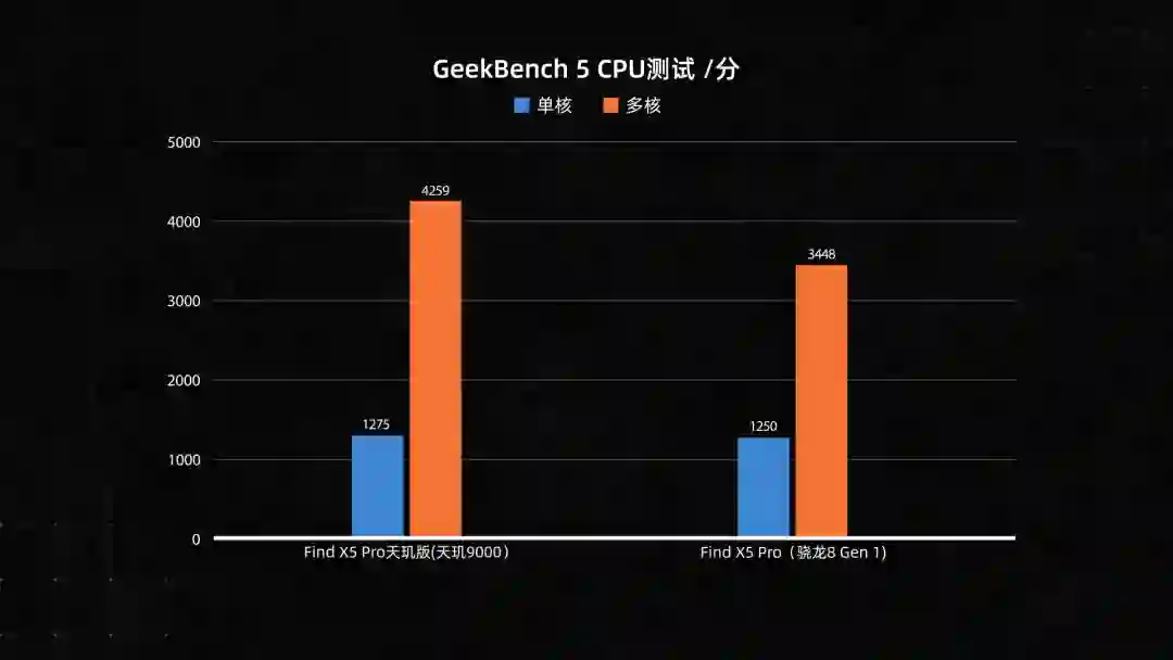然后我们分别测试 CPU 和 GPU 的表现。首先是 CPU ,Geekbench 5 天玑版单核跑分成绩 1275,骁龙版 1250,相差不大。多核成绩上,天玑版 4259 的成绩可以说是碾压骁龙版。