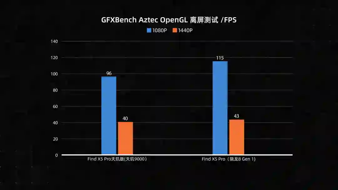 GPU 部分,GFXbench Aztec OpenGL 离屏测试,天玑版 1080P 和 1440P 分别跑出了 96 帧和 40 帧的成绩,而骁龙版则是 115 帧和 43 帧,可见 GPU 综合性能上,天玑 9000 和骁龙 8 Gen 1 还是有一定差距。