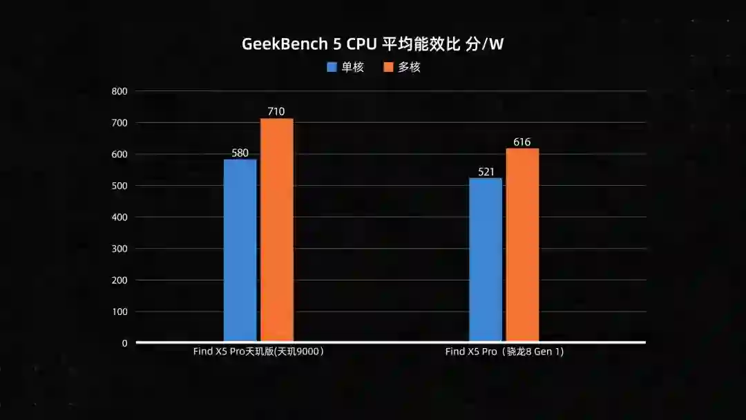 换算成能效比,天玑版单核 580,多核 710,骁龙版单核 521,多核 616。单核能效比差距并不大,而多核天玑版明显优于骁龙版。