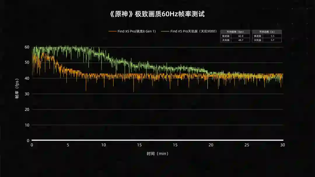 下面就是大家喜闻乐见的《原神》项目,我们直接用极致画质 60 帧来测。从帧率曲线上看的话,天玑是要比骁龙强不少,坚持了 7 分钟才开始降频,骁龙版是一开始就往下掉了,7 分钟之后开始锁帧。但是平均帧率一个 48.7 一个 42.8,这波天玑完全是靠同行衬托了,都没好到哪儿去,说明 OPPO 的调度策略还是太保守了。功耗上来看天玑版略高于骁龙版。