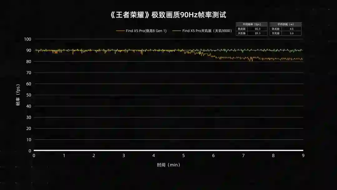 《王者荣耀》最高画质 90 帧,骁龙版平均帧率 86.5 帧,基本上 5 分钟之后就开始降频,而天玑版则基本全程稳定在 90 帧左右,功耗方面,天玑版 3.6W,骁龙版 4.6W。