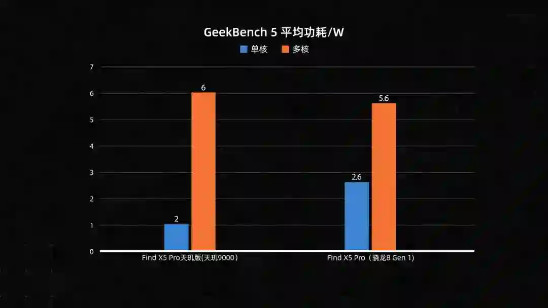 功耗方面,天玑版单核平均功耗约 2W,骁龙版则是 2.6W,多核天玑版平均功耗 6W,骁龙版 5.6W。