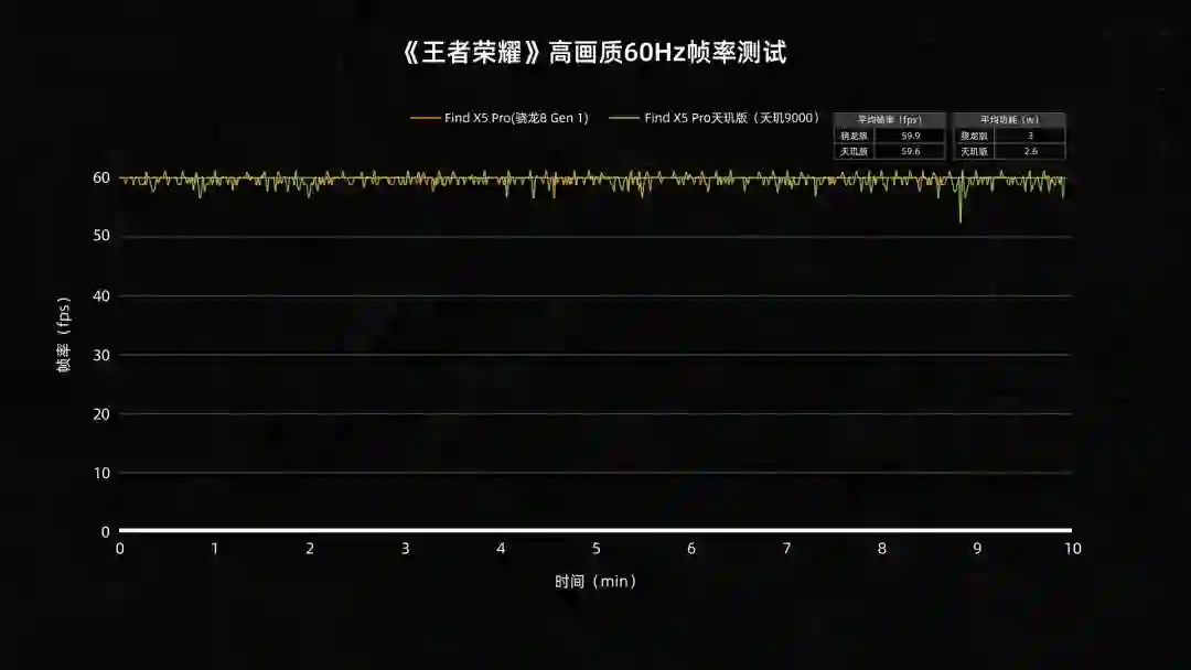 下来就是我们的重头戏游戏实测环节。《王者荣耀》高画质 60 帧,两款机型基本都能跑满,不过骁龙版的帧率曲线更为平滑,天玑版整机平均功耗约 2.6W,骁龙版则是 3W。