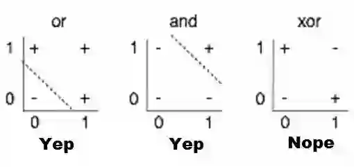 他们分析中,最被广为讨论的内容就是对感知机限制的说明,例如,他们不能学习简单的布尔函数XOR,因为它不能进行线性分离。虽然此处历史模糊,但是,人们普遍认为这本书对人工智能步入第一个冬天起到了推波助澜的作用——大肆炒作之后,人工智能进入泡沫幻灭期,相关资助和出版都遭冻结。