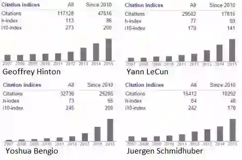 如果这是一部电影,2012年ImageNet比赛将是其高潮,而现在在电影结束的时候,我们将会出现这几个字:「他们如今在哪里」。Yann Lecun:Facebook; Geoffrey Hinton: 谷歌; 吴恩达: Coursera、谷歌、百度; Bengi、Schmidhuber 及 Hochreiter 依然还留在学术界——但我们可以很容易推测,这个领域将会有更多的引用及毕业生。