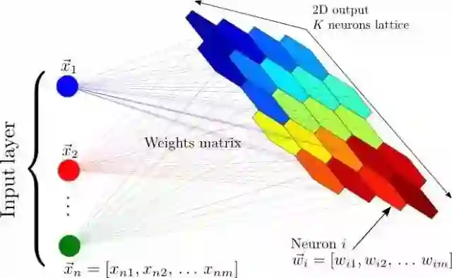 自组织映射神经网络:将输入的一个大向量映射到一个神经输出的网格中,在其中,每个输出都是一个聚类。相邻的神经元表示同样的聚类。